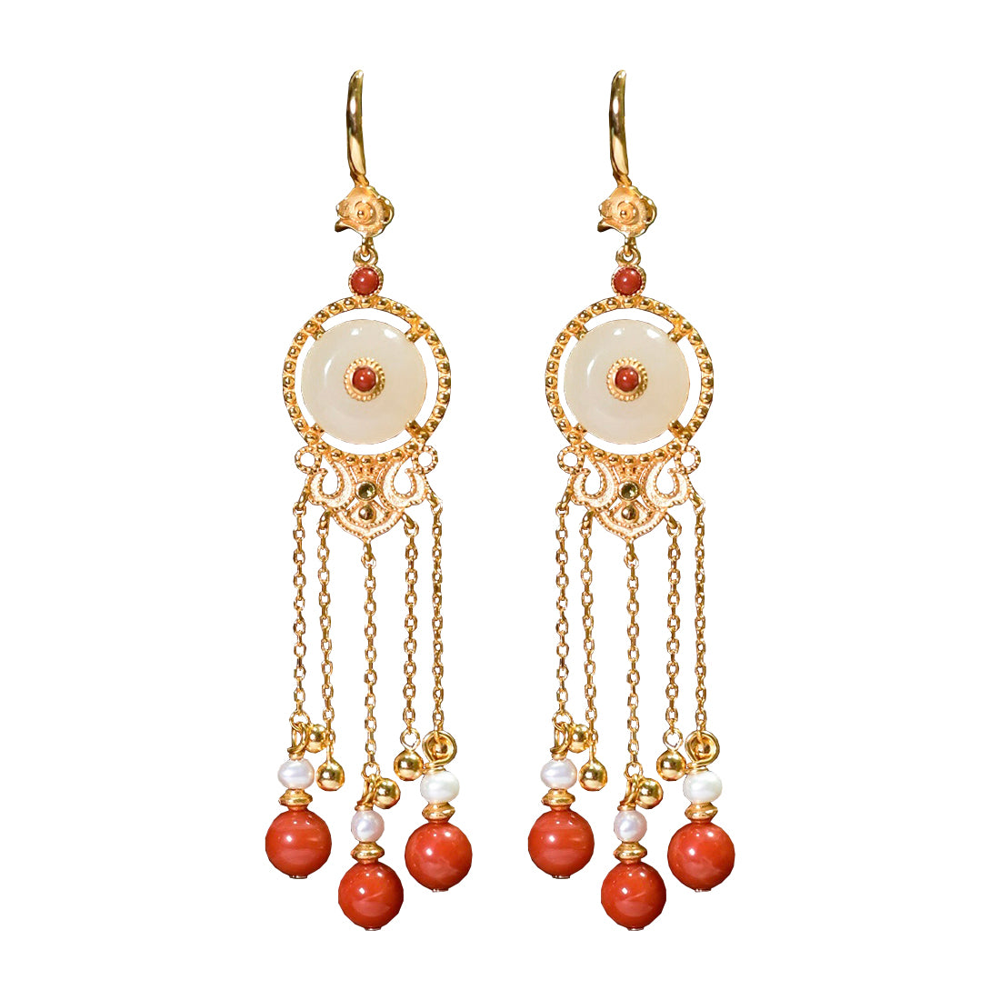 Ancient Style Long Tassel Hetian Jade Malachite Auspicious Cloud Earrings