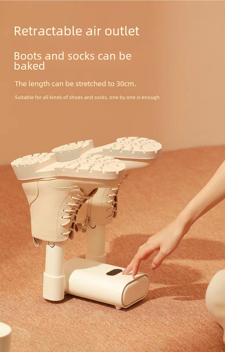 This smart retractable timer shoe dryer has the functions of warming shoes, sterilizing, deodorizing and drying. It is a must-have shoe care tool for home use. Intelligent timing control, easy operation, efficient drying of shoes while maintaining a comfortable temperature. Built-in sterilization function, effectively removes bacteria in shoes and protects the health of feet. Deodorization function keeps shoes fresh and says goodbye to odor. The retractable design is easy to store and saves space. It is suitable for use in a variety of environments such as home and office. It makes your shoes dry quickly, comfortable and fresh. It is an ideal choice for home life and travel.