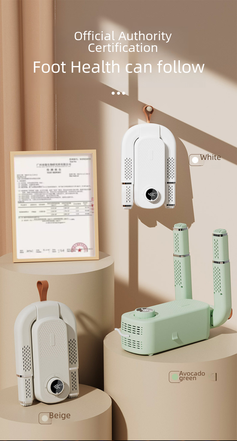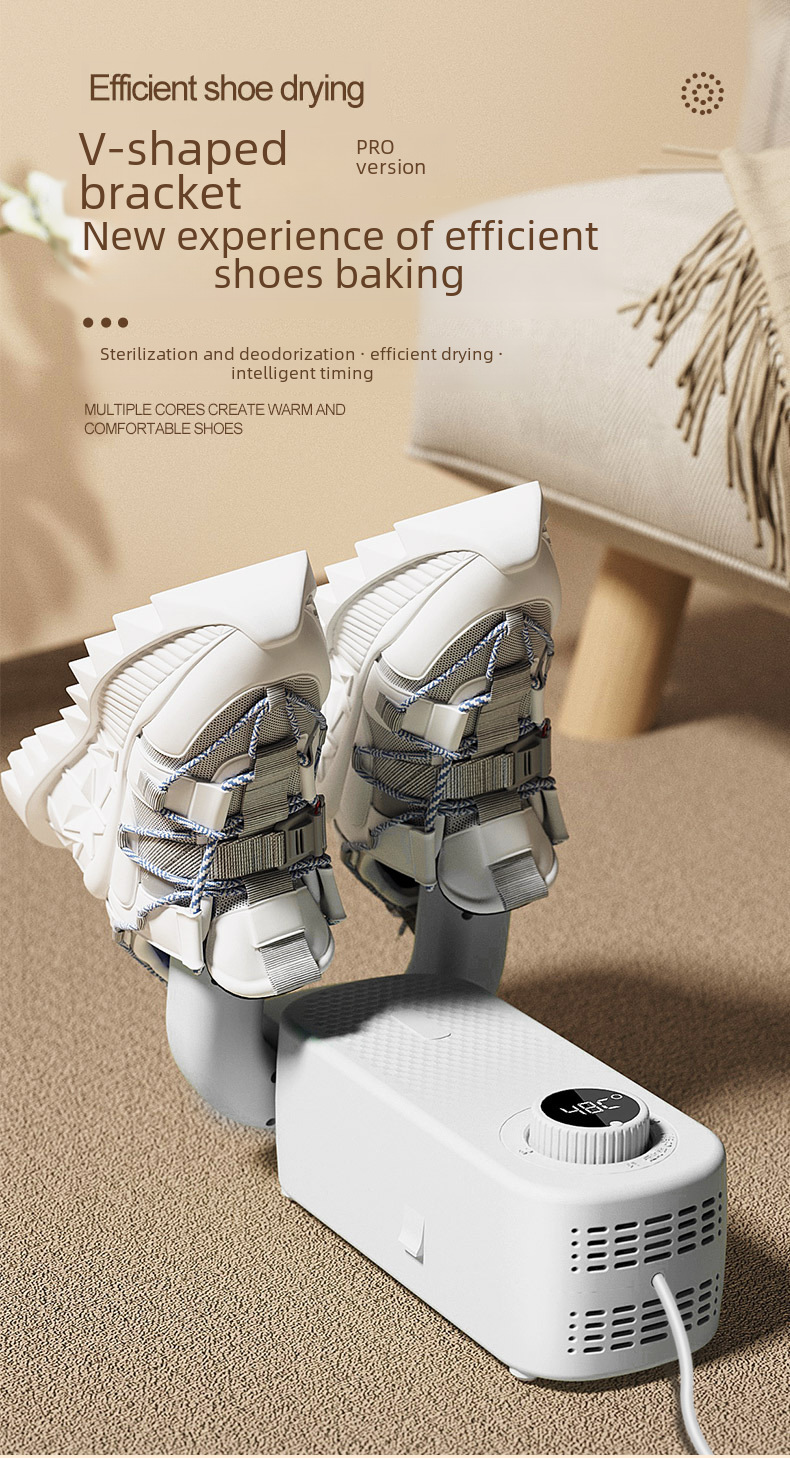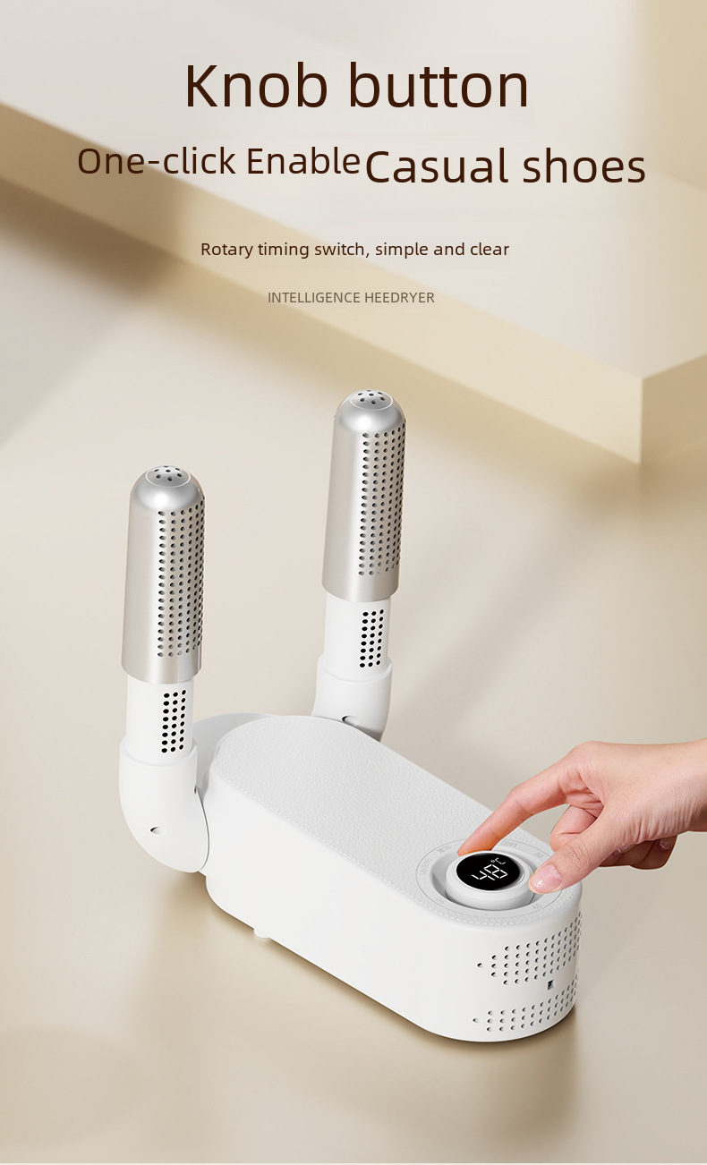 This smart timed shoe dryer is foldable and adjustable for easy storage and portability. It uses quick-drying technology to quickly dry shoes and keep the shoe materials intact. Built-in deodorizing and sterilizing functions effectively remove odors and eliminate bacteria to ensure fresh and hygienic shoes. It is suitable for all types of shoes, especially for sports shoes, leather shoes and rain boots. The smart timing function allows you to easily set the working time, saving energy and improving efficiency. It is an ideal shoe dryer for home, office and travel, and a perfect solution to the problem of wet shoes and odor.