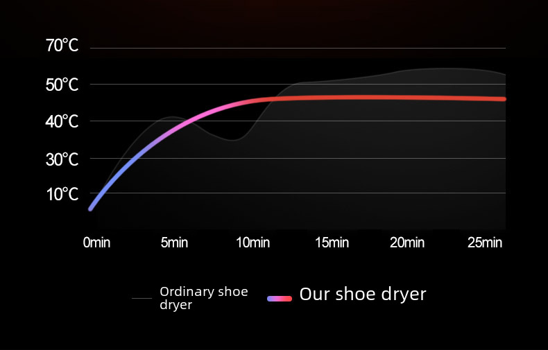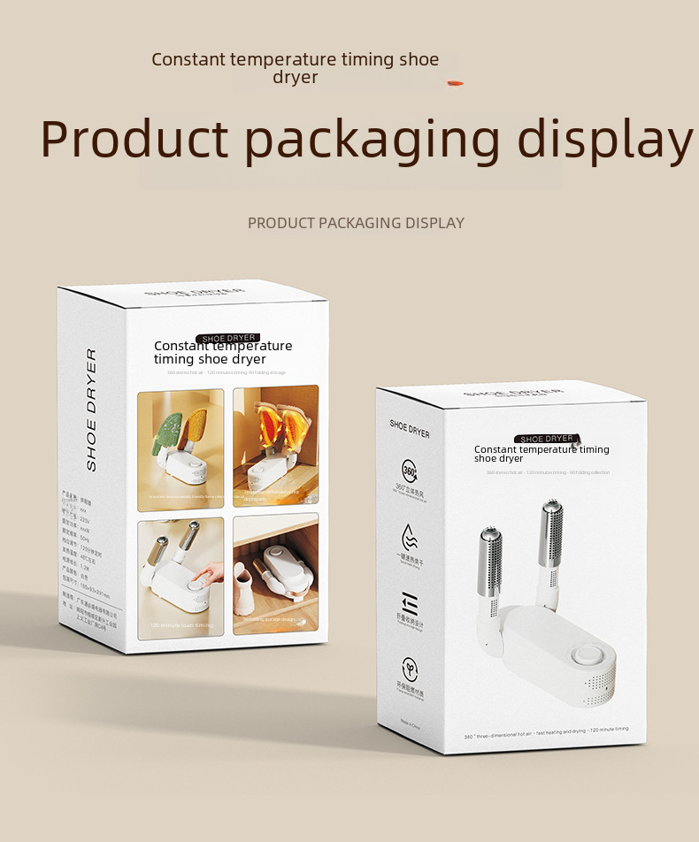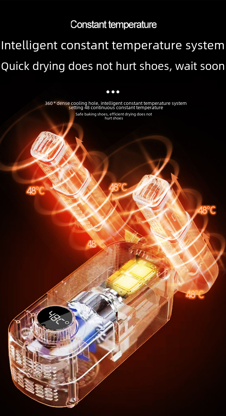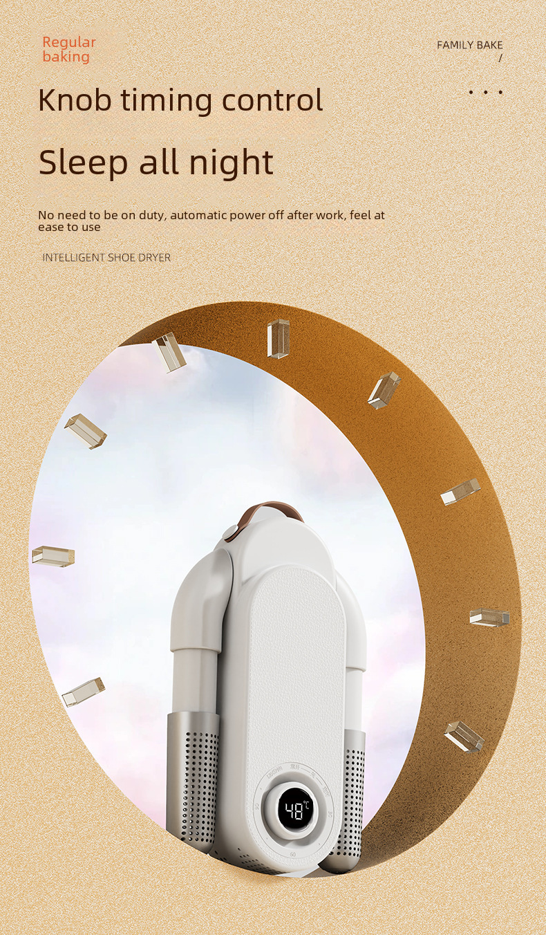 This smart timed shoe dryer is foldable and adjustable for easy storage and portability. It uses quick-drying technology to quickly dry shoes and keep the shoe materials intact. Built-in deodorizing and sterilizing functions effectively remove odors and eliminate bacteria to ensure fresh and hygienic shoes. It is suitable for all types of shoes, especially for sports shoes, leather shoes and rain boots. The smart timing function allows you to easily set the working time, saving energy and improving efficiency. It is an ideal shoe dryer for home, office and travel, and a perfect solution to the problem of wet shoes and odor.