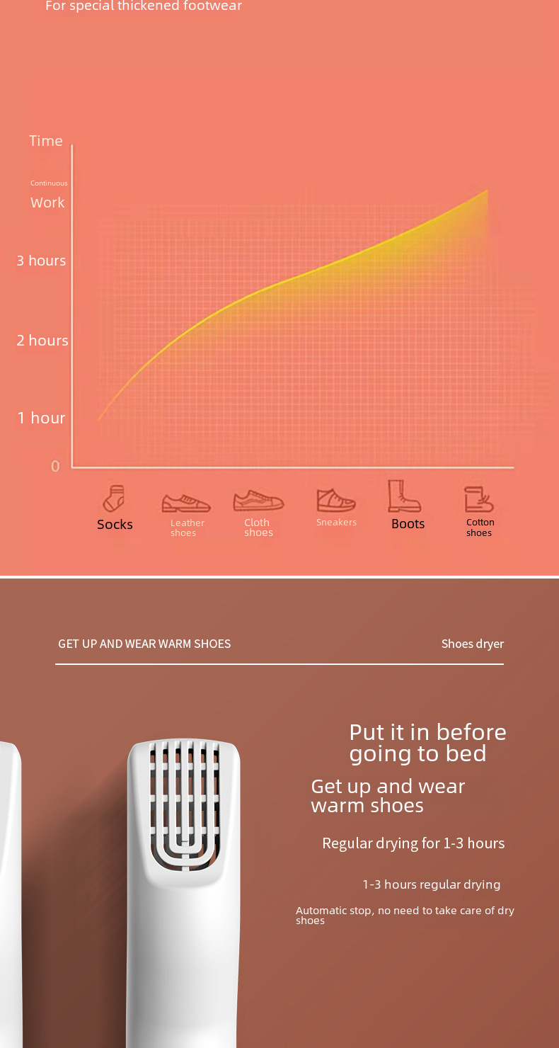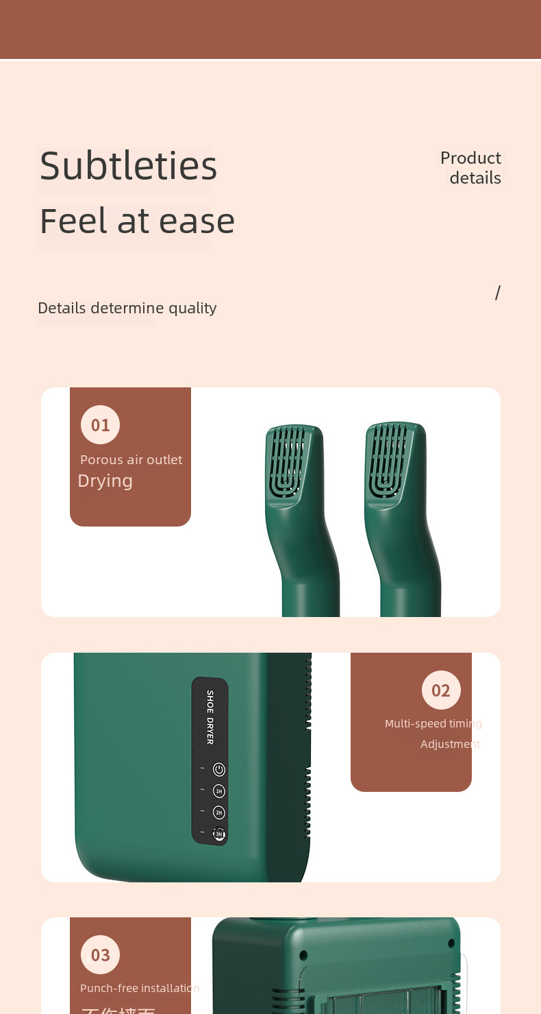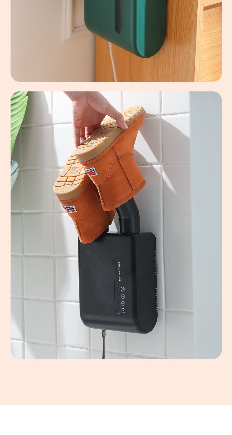 This wall-mounted shoe dryer is equipped with a timer function and UV sterilization technology to effectively remove bacteria and odors from shoes. The intelligent constant temperature design ensures that shoes are dried at the optimal temperature to prevent overheating and damage to the shoe materials. The internal circulation shoe drying function accelerates moisture evaporation and allows shoes to dry quickly. Suitable for home and office use, it saves space and is easy to install. Whether it is sports shoes, rain boots or work shoes, this shoe dryer can provide efficient and clean care to keep shoes fresh and comfortable.